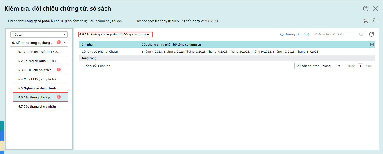 Trường hợp trong kỳ có tháng chưa thực hiện phân bổ CCDC, chương trình sẽ hiển thị báo cáo liệt kê chi tiết các tháng này.